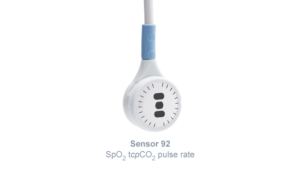 tcpCO2는 피부 표면에 센서를 부착하여 측정합니다. tcpCO2 센서는 Stow-Severinghaus 원리를 이용합니다. CO2가 물과 반응하여 탄산과 H+로 분해되는데, 이 때 생성된 H+는 pH 유리 전극을 통해 측정됩니다. 그 이후 센서에 적용되어 있는 알고리즘에 의해 tcpCO2가 mmHg 또는 kPa 단위로 계산됩니다.