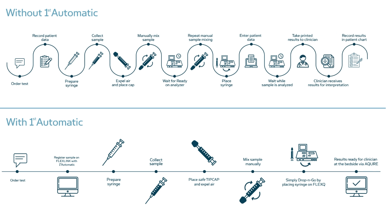 ABL800 FLEX 및 safePICO 주사기를 A AQURE의 FLEXLINK 시스템과 결합하여 1st Automatic을 활용하십시오. 연결된 솔루션이 환자, 작업자 및 검체 ID를 병상에서 등록하는 동안, FLEXLINK는 이 데이터를 함께 연결합니다. 작업 흐름을 가속화할 수 있는 방법의 예가 아래에 나와 있습니다.